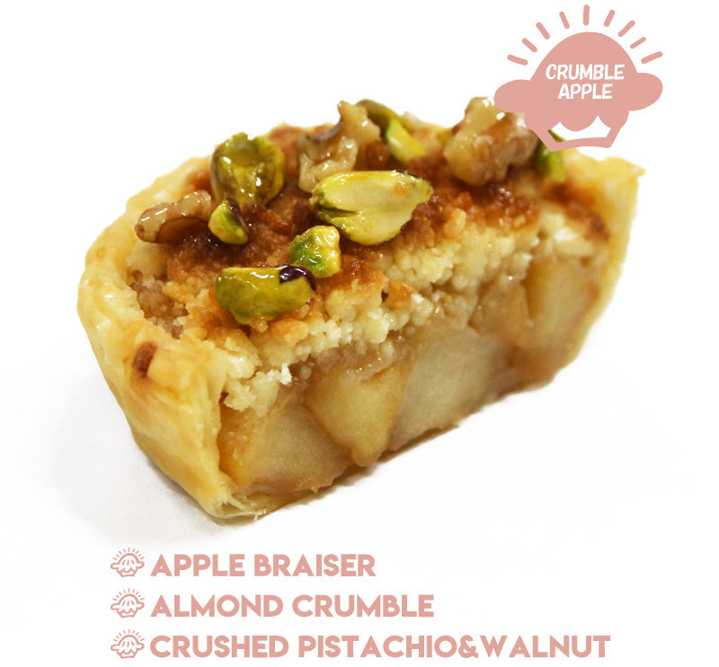 リンゴを丁寧にことこと煮て、1日寝かしたアップルフィリングはとても美味!仕上げに、クランブルと木の実をトッピングすることで、食感と風味に更に奥行きがでました!※アップルパイは冷蔵庫で6時間の解凍でも美味しく召し上がることができます。